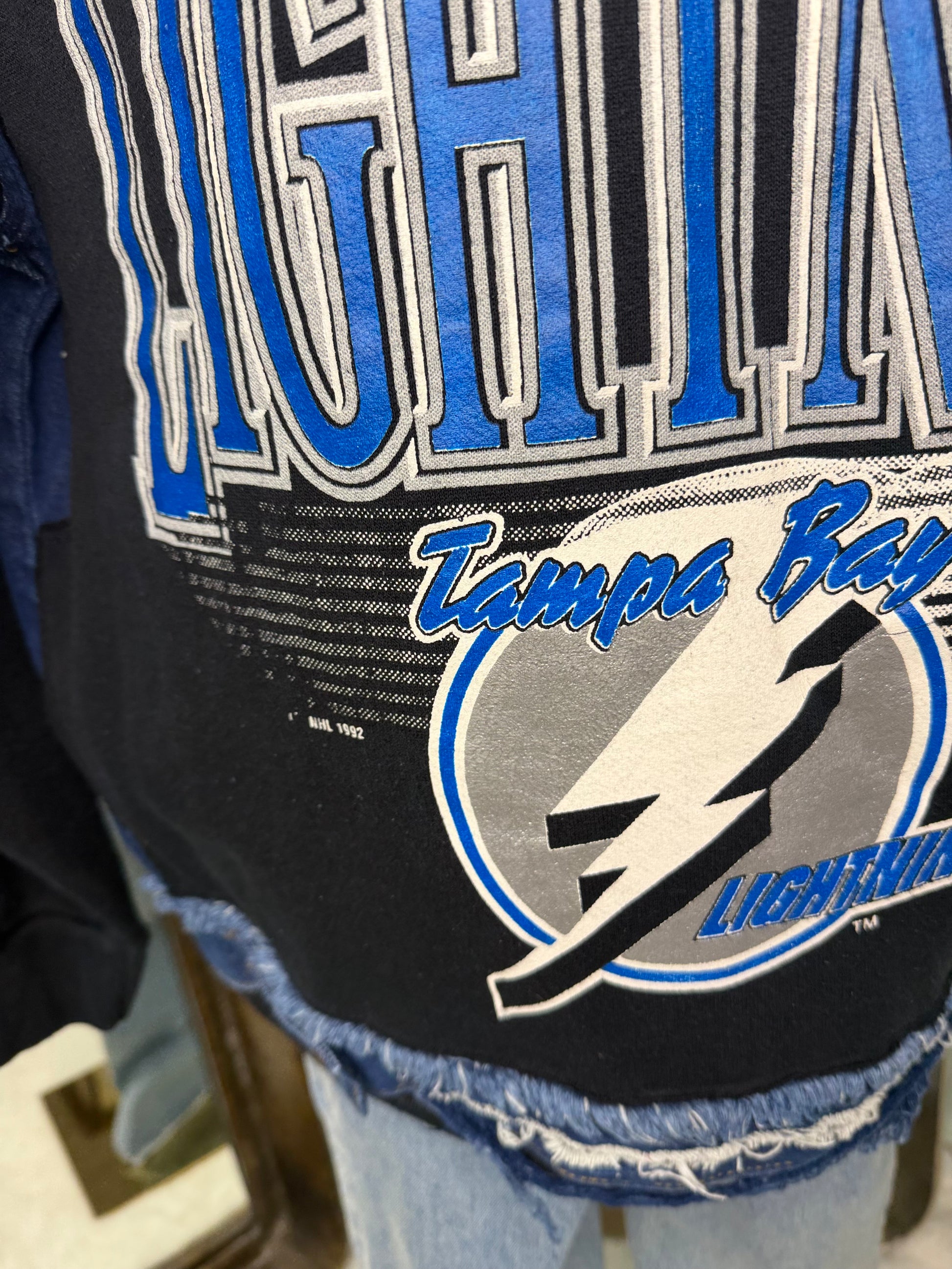Vintage logo 7 crewneck sweatshirt turned into denim jacket. Dark wash distressed jacket! one of a kind!